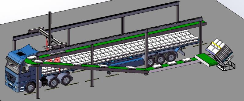 本方案采用桁架机器人进行装车码垛,拆垛机供给方式供料。