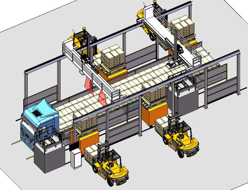 双桁架机器人进行装车,轨道车跟随桁架升降方式供料。